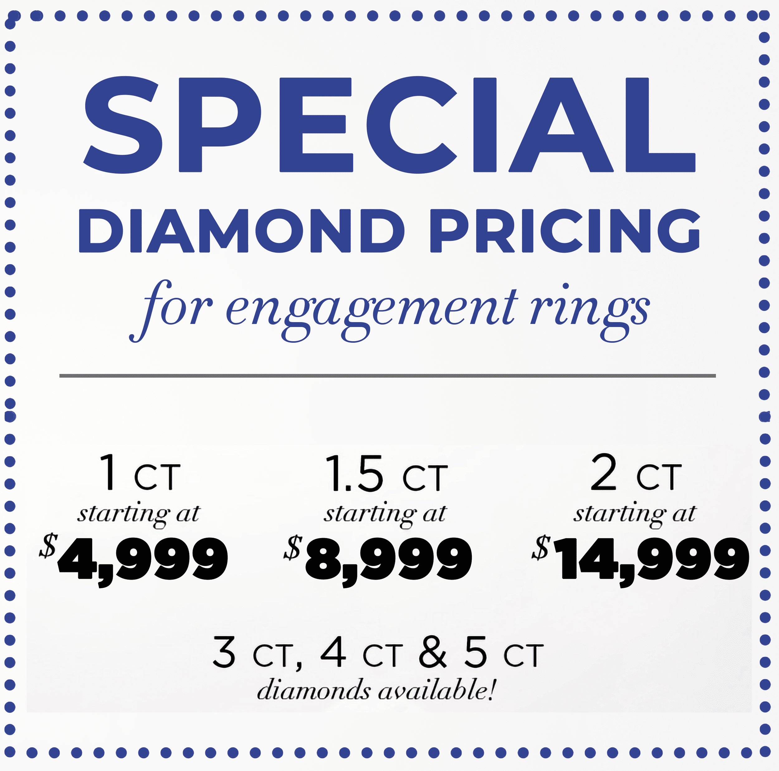 During the event, limited quantities of specially priced diamonds will be available, 1 CT starting at $4999, 1 1/2 CT starting at $8999 & 2 CT starting at $14,999!*