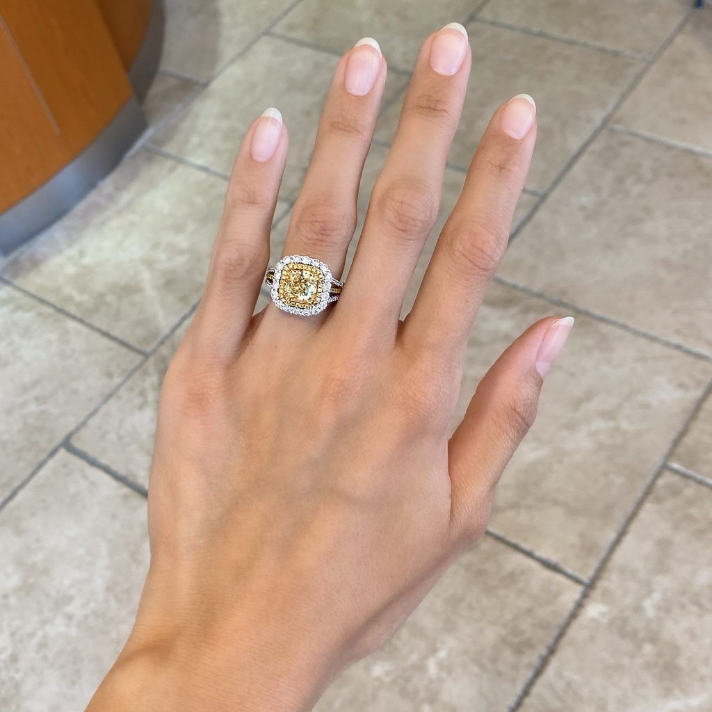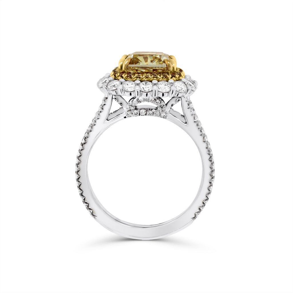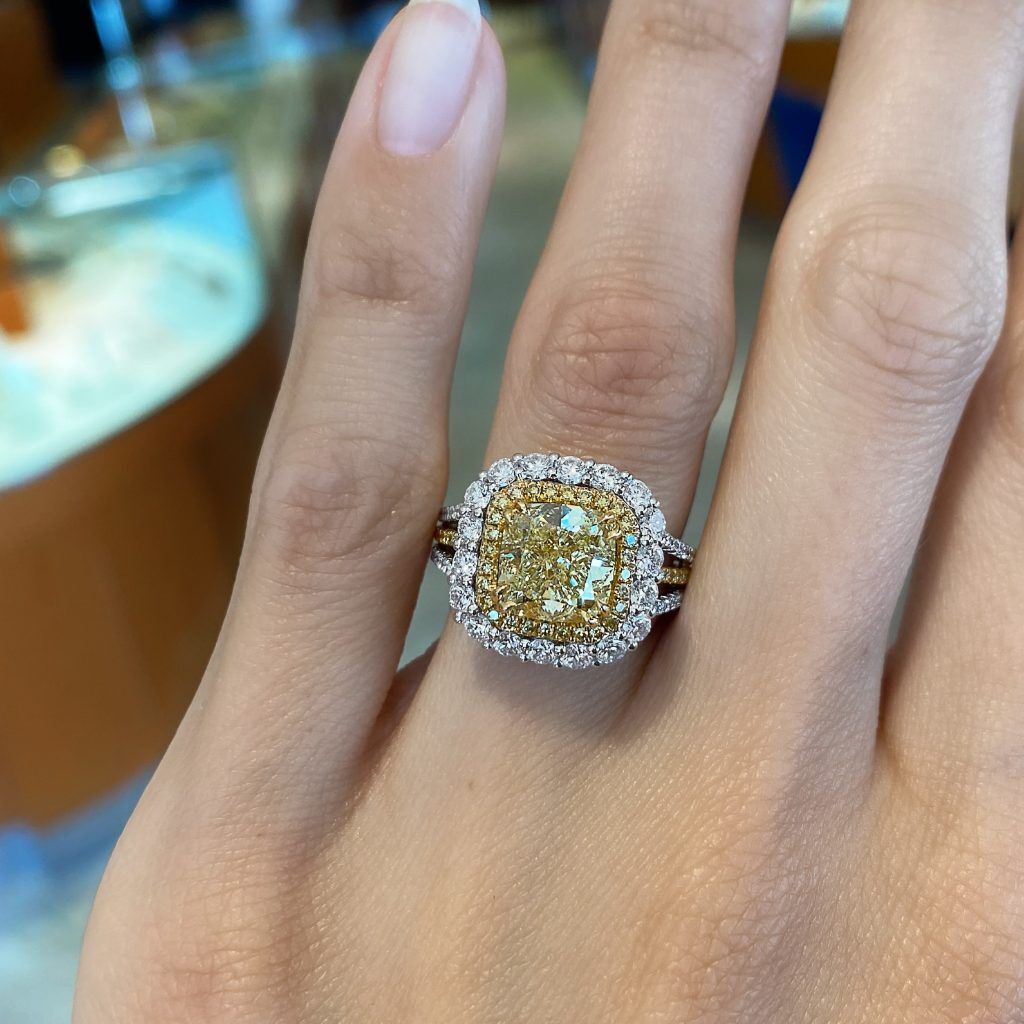 A stunning cushion cut canary diamond rests in a double claw prong setting and a halo of yellow diamonds. The three row band also features a center band of yellow gold and yellow diamonds.