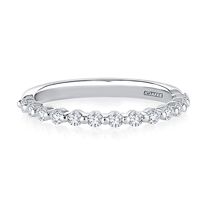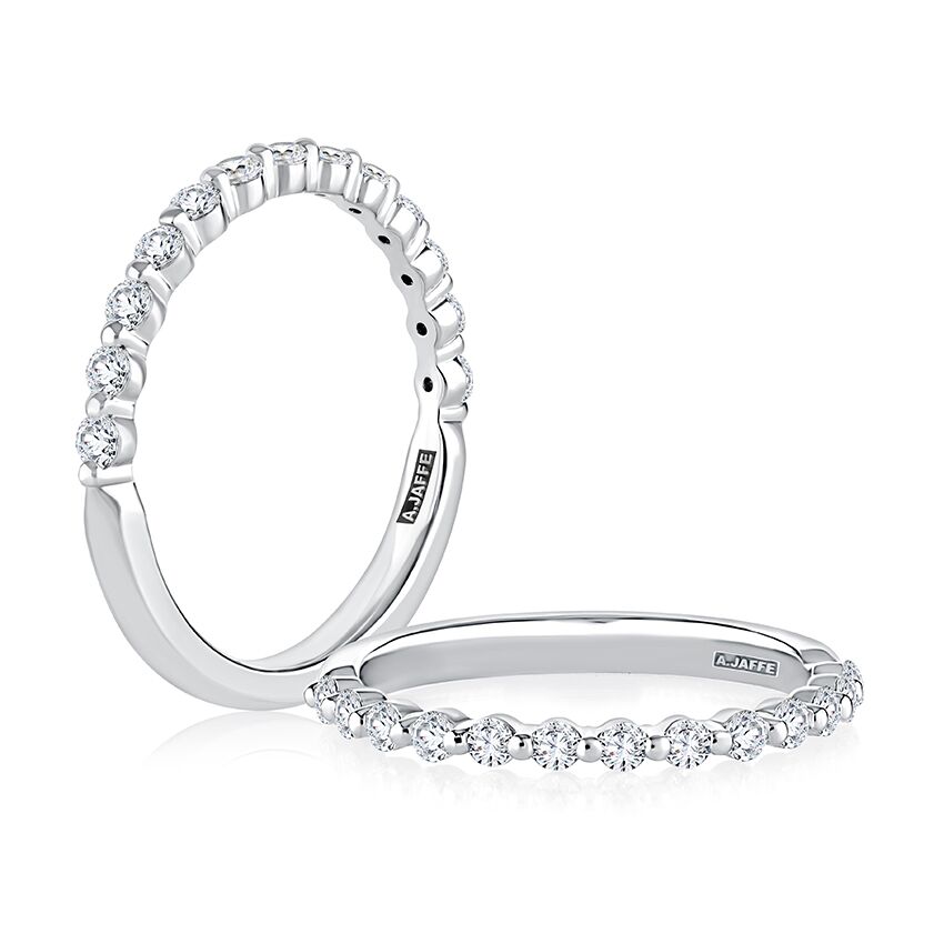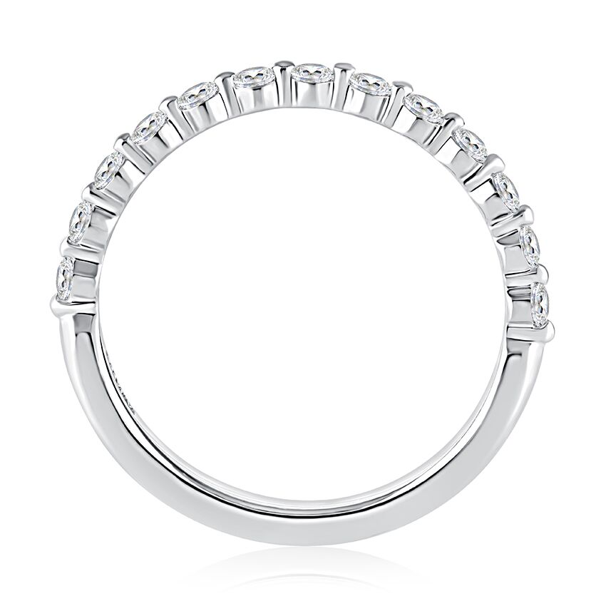 A single shared prong helps hold the sparkling diamonds place in this luxurious band style. This beautiful diamond band is perfect for the modern bride who prefer a classic and neat look.