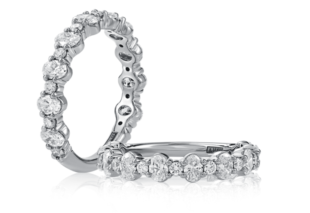 Timeless elegance meets refined artistry in this A.JAFFE Round and Oval Diamond Band — a celebration of enduring love and graceful design. Set in luminous 14 karat white gold, alternating round and oval diamonds create a rhythmic silhouette of sparkle and sophistication. Each diamond is individually handset, reflecting A.JAFFE’s heritage of over 130 years of masterful craftsmanship and innovation. With a total weight that dances subtly across the finger, this diamond band exudes understated luxury and makes a versatile statement — worn alone, paired with an engagement ring, or layered for a modern bridal stack. Experience unparalleled comfort and beauty, the signature of A.JAFFE and Ancona Jewelers.