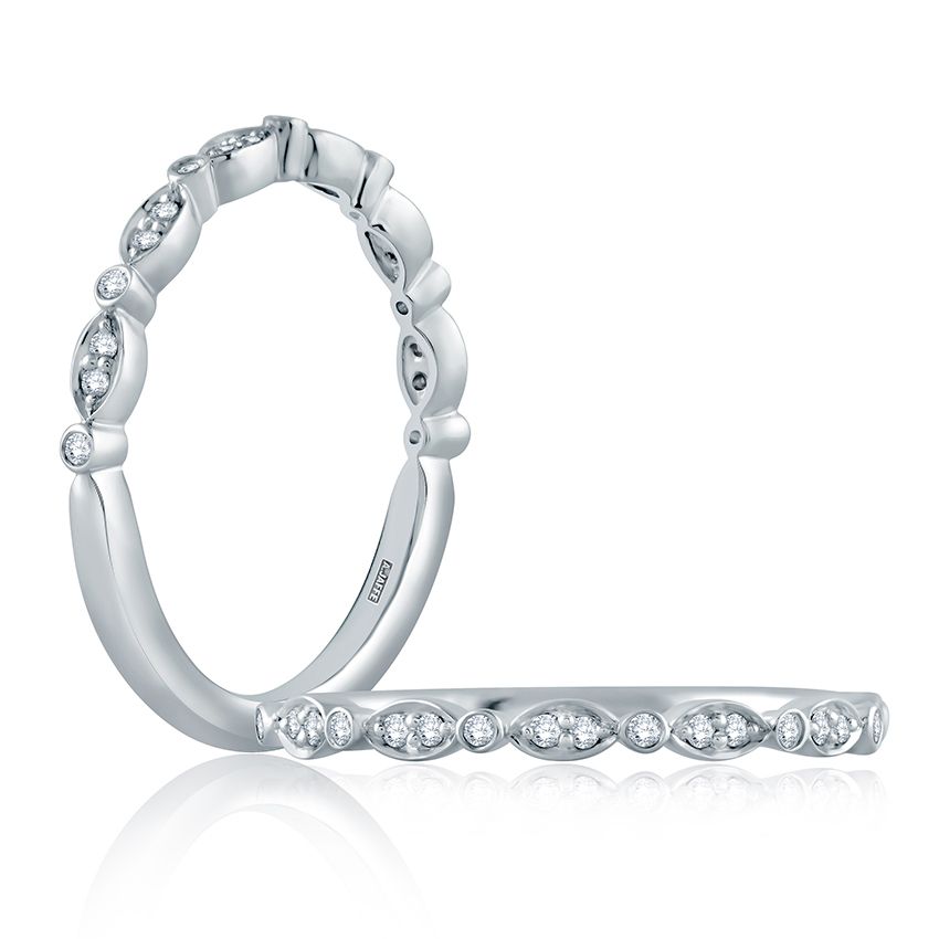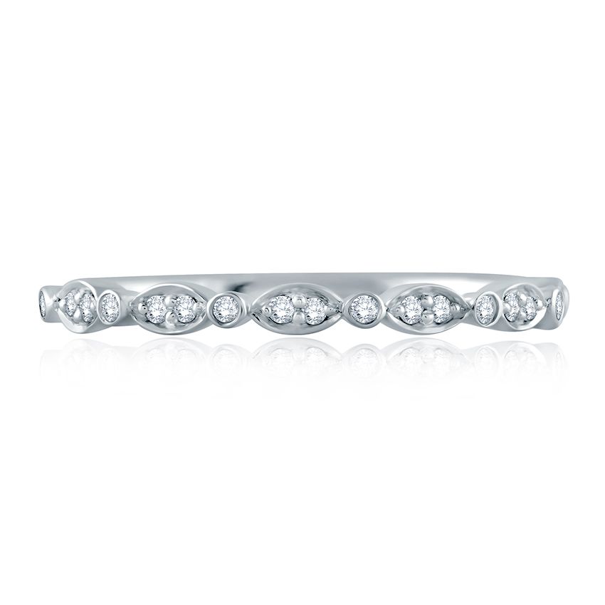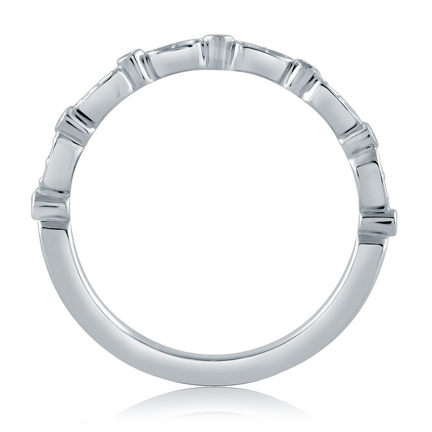 This stackable half circle band features a repeating pattern of round diamonds set in a marquise and round shape.