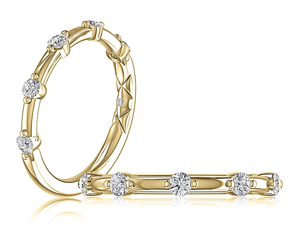Ladies diamond band in 14 karat yellow gold. Set in the band are six round brilliant cut diamonds with a total weight of 0.23 carat. The diamonds average SI2 in clarity and G in color.