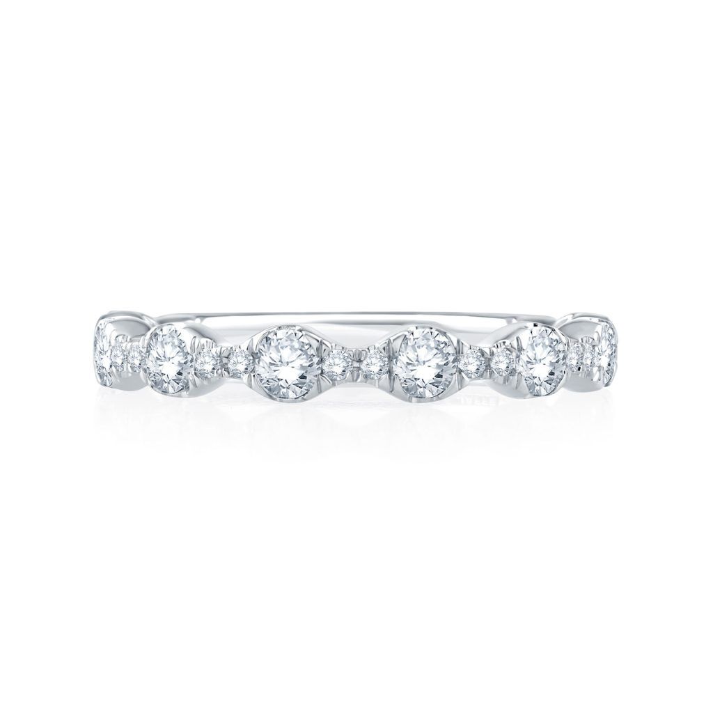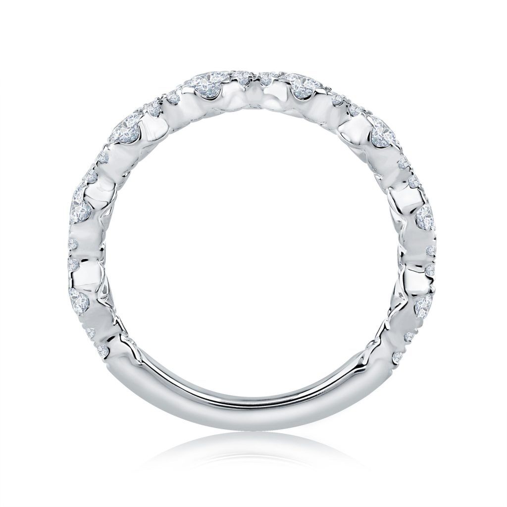 From the Seasons of Love collection comes this romantic Floating Bubble Diamond Wedding Band. Featuring an alluring pattern of alternating marquise and dot shapes set with diamonds, this wedding ring can be paired with a wide range of engagement ring styles. What’s more, this wedding band features a luxurious quilted pattern that expertly balances the center diamond upright.