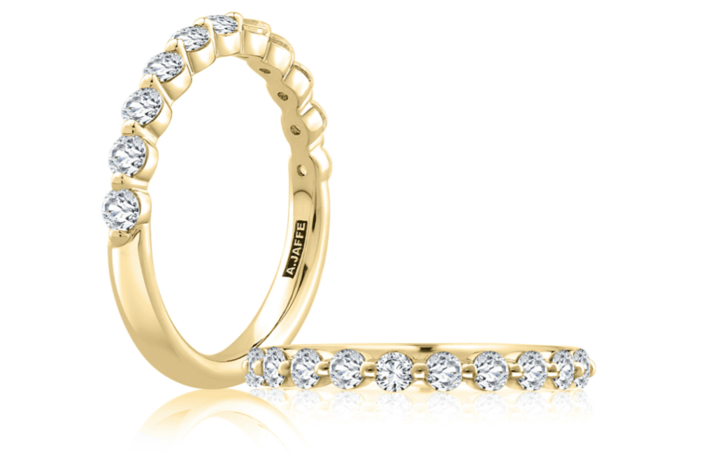 A single shared prong helps hold the sparkling diamonds place in this luxurious band style. This beautiful diamond band is perfect for the modern bride who prefer a classic and neat look.
