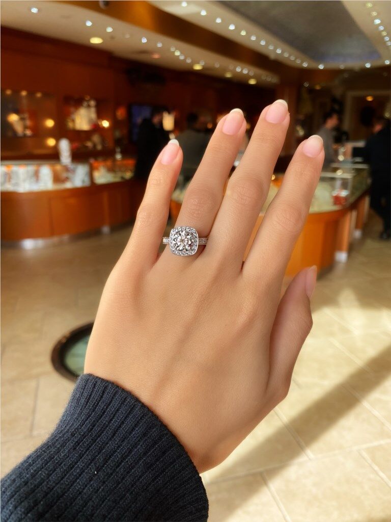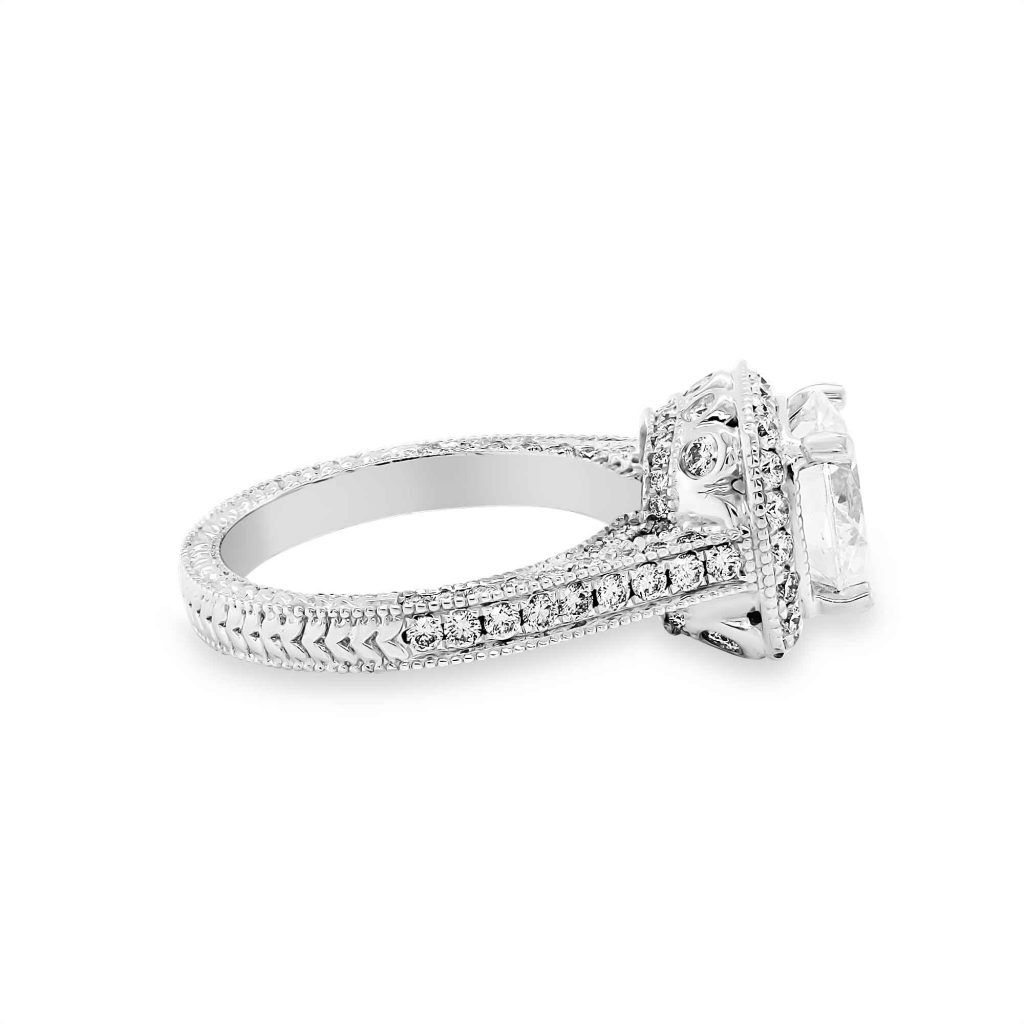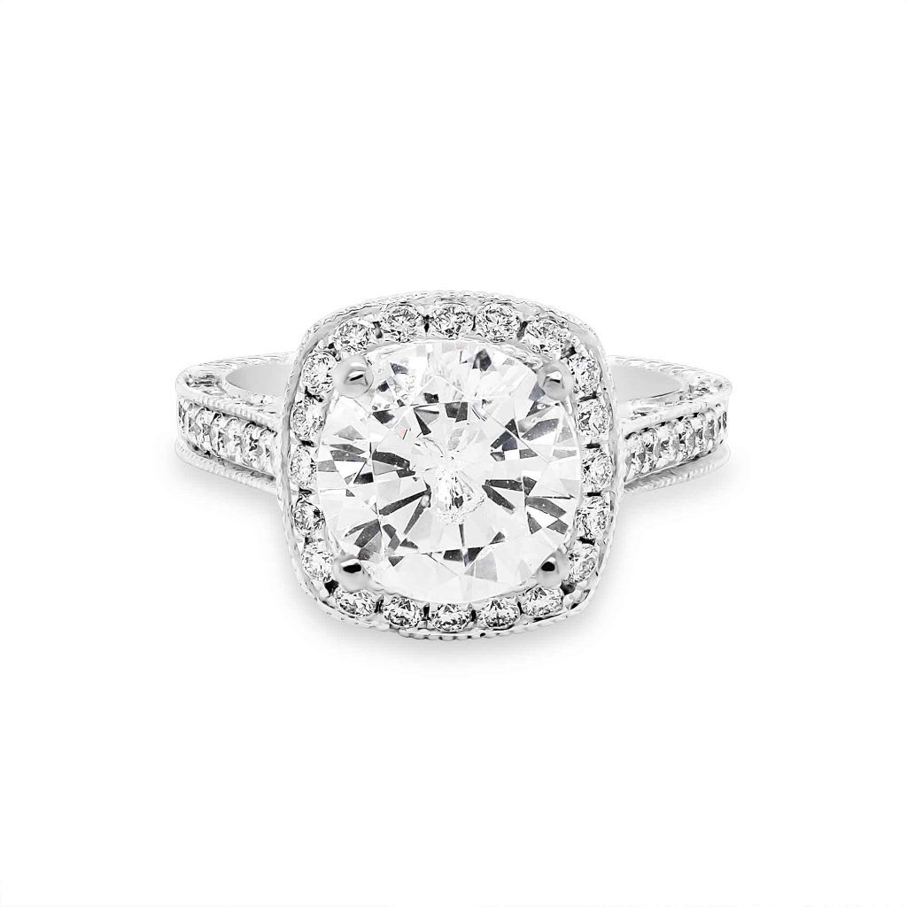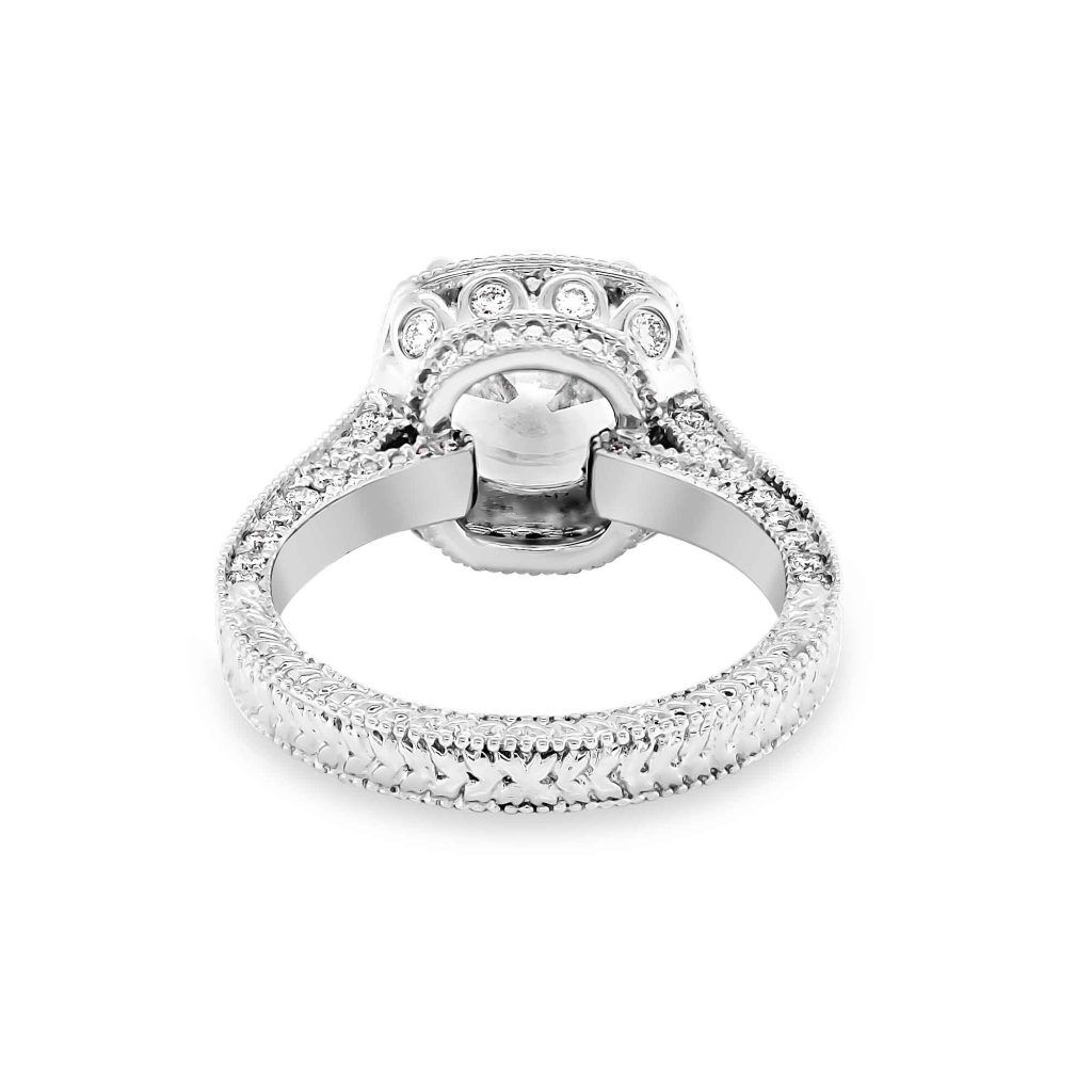 Delicate details of milgrain and engravings create a stunning sillhouette for round diamonds set in tis vintage style cushion halo engagement ring.