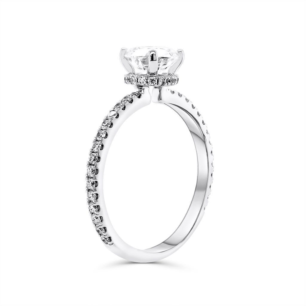 What seems to be a traditional white gold diamond engagement ring has two hidden surprises; a sparkling hidden halo of diamonds around your center stone, and a floating design underneath the center stone as well!