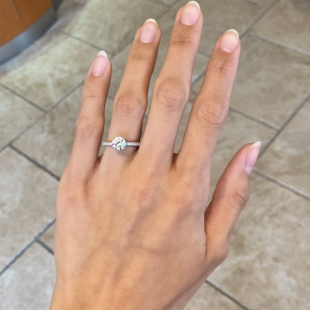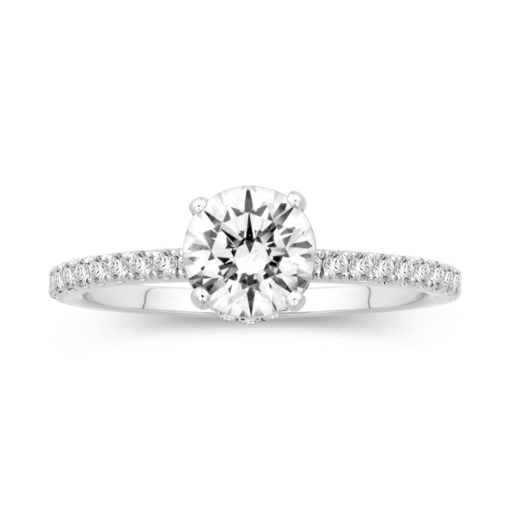 What seems to be a traditional white gold diamond engagement ring has two hidden surprises; a sparkling hidden halo of diamonds around your center stone, and a floating design underneath the center stone as well!