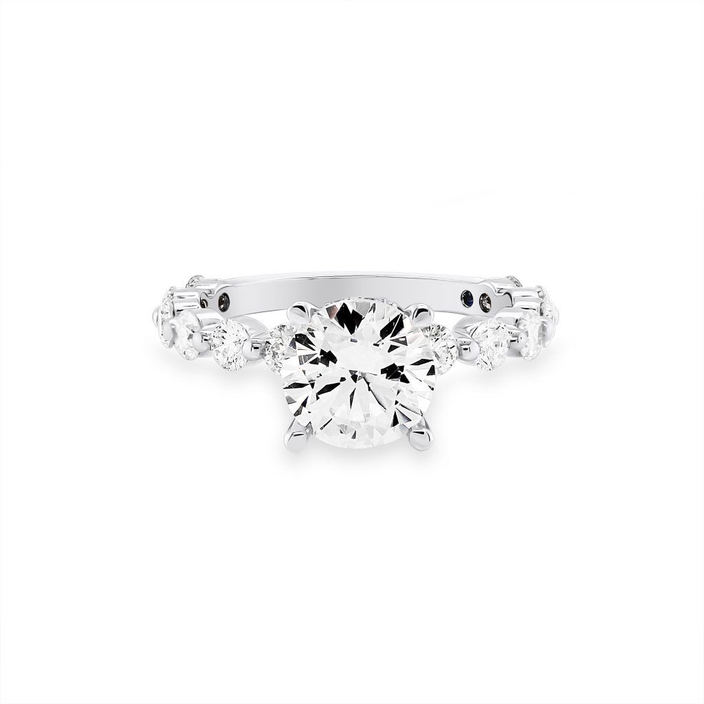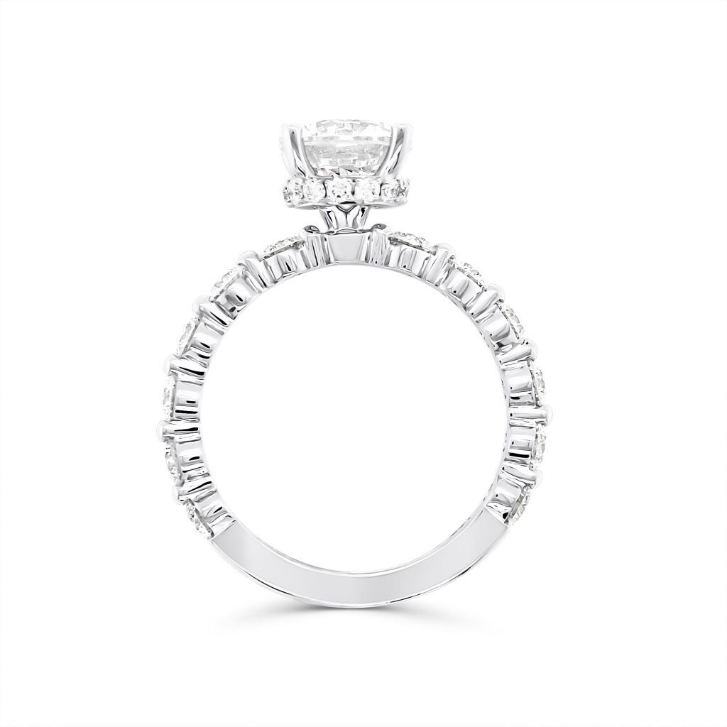 Stunning round diamonds are stationed between petite white gold bars along the front half of this beautiful engagement ring setting.