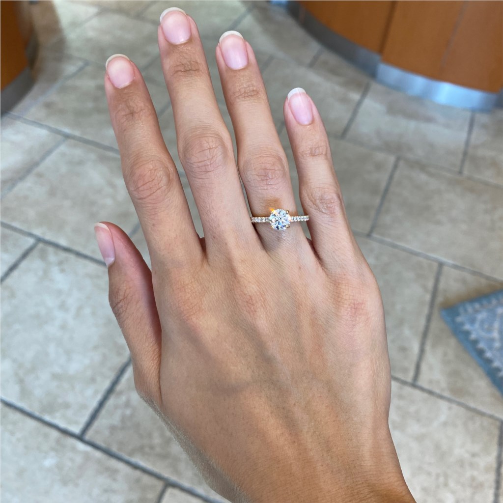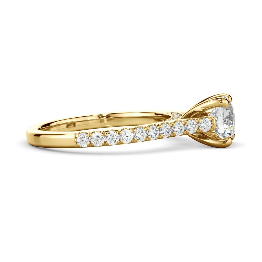 Only the best diamonds are set in this timeless and one of a kind engagement ring. Round diamonds lay in a beautiful arch, holding up your precious center stone!