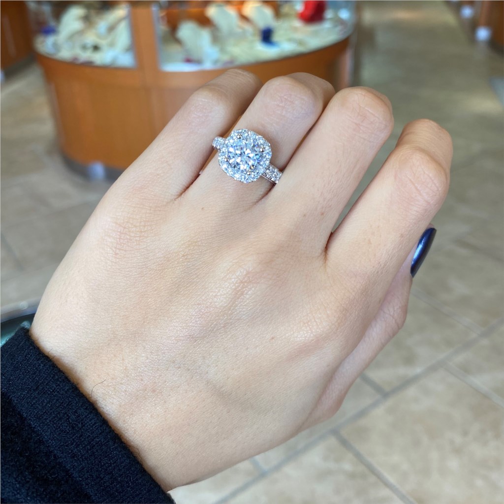 A brilliant round diamond rests in a cushion cut halo with 12 round diamonds to create the bloom. This ring is set in polished 14k white gold.