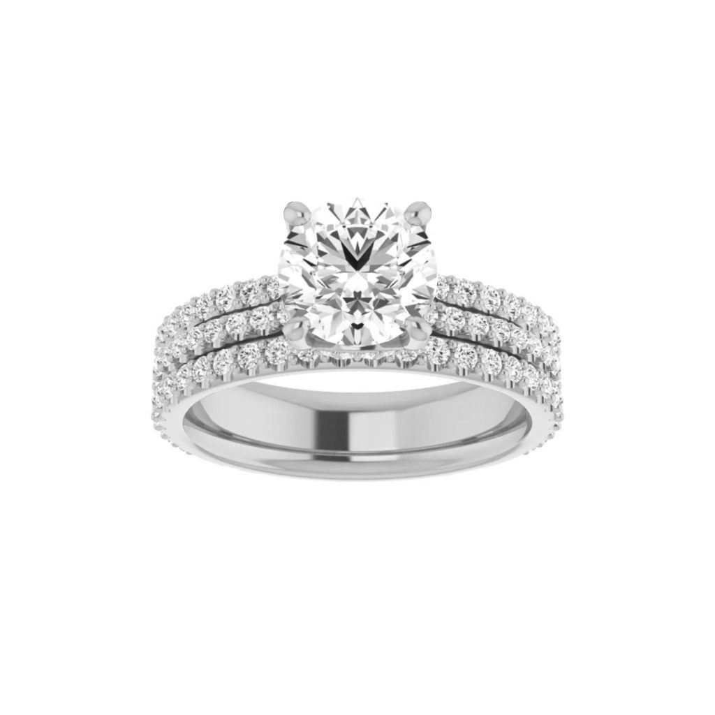 A brilliant round diamond is highlighted by three diamond bands, with the center band raised to give your center stone the utmost attention.