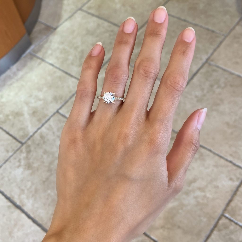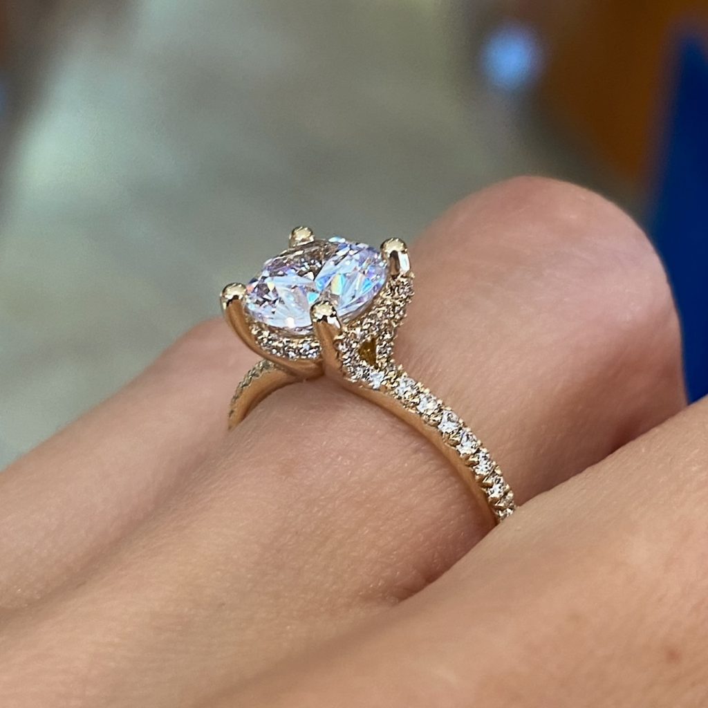 This elegant yellow gold diamond band features diamonds cascading up the four prongs hugging the center stone, as well as encompassing it with a hidden halo.