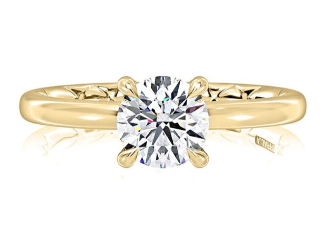 This stunning four prongs diamond engagement ring features a Classic Round Center Stone. The ring highlights a solitaire setting to give all of the attention to the center stone. Lastly, the band features a quilts interior that prevents the ring from spinning.