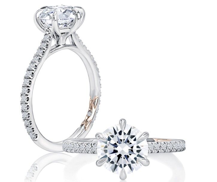 This delicate six prongs stunning engagement ring showcases a beautiful round center stone with . The ring features a hand set pave diamond band that adds the sparkle you need in your life.