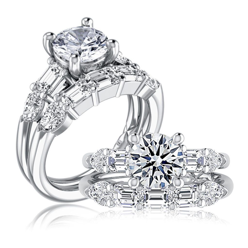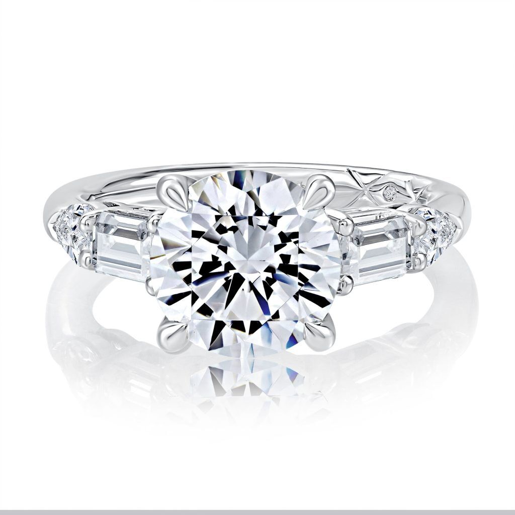 This sparkling engagement ring features a stunning Round Center Stone. The shank highlights brilliant Pear and Emerald Shaped Diamonds on both sides of the center stone. Made for the modern bride who prefer a mix of class and luxury.