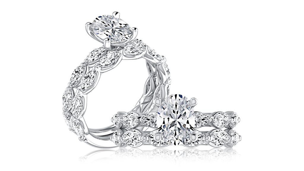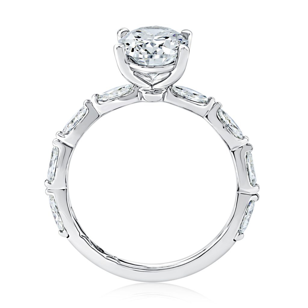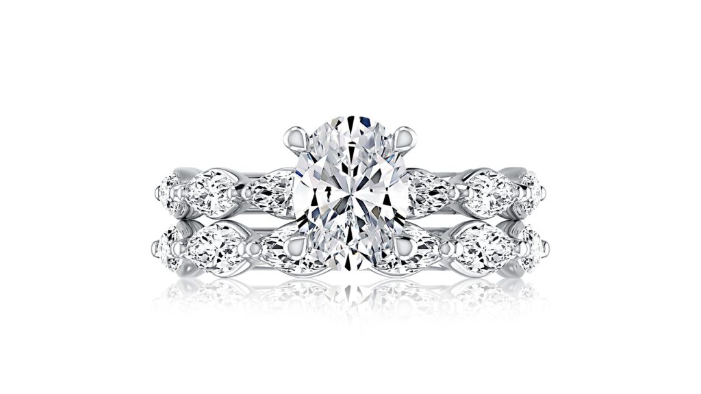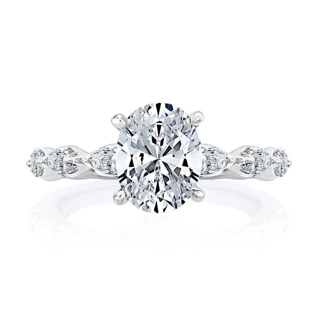 This engagement ring features a stunning oval center stone supported by four prongs. The marquise diamonds that envelop the band add to the overall brilliance of the ring. Made for the modern bride with a chic twist.