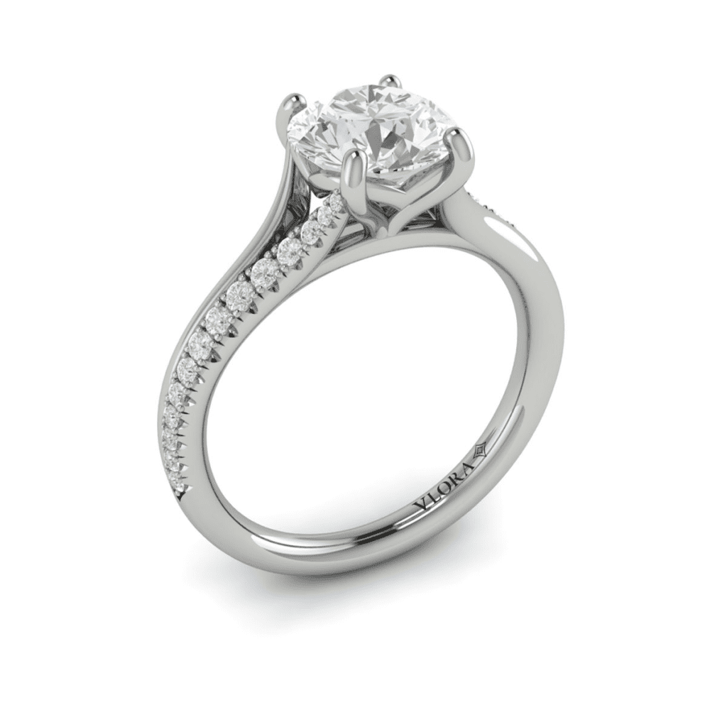 Two paths converge into one romantic love story with this diamond engagement ring with split shank. A single polished strand and a diamond pave strand reverse like a mirror relection, framing the sparkling round center diamond in contrast. The Vlora signature V-shaped setting elevates the center stone, letting love’s brilliance dance through each facet. Celebrate your unique journey with a split shank engagement ring that shines as bright as your shared future.