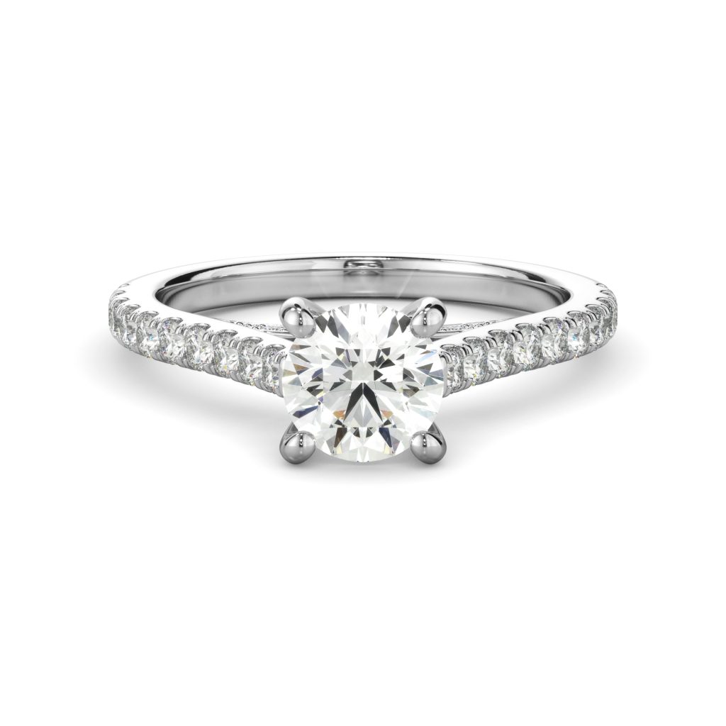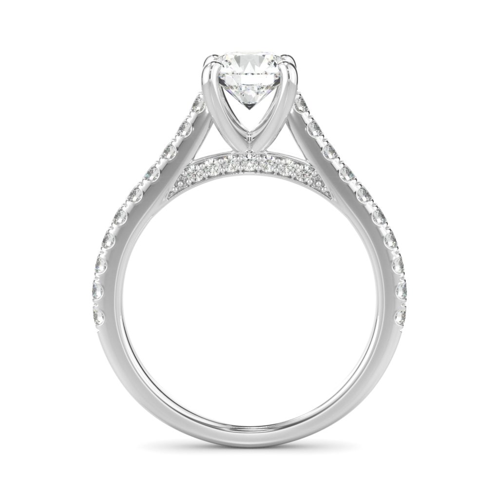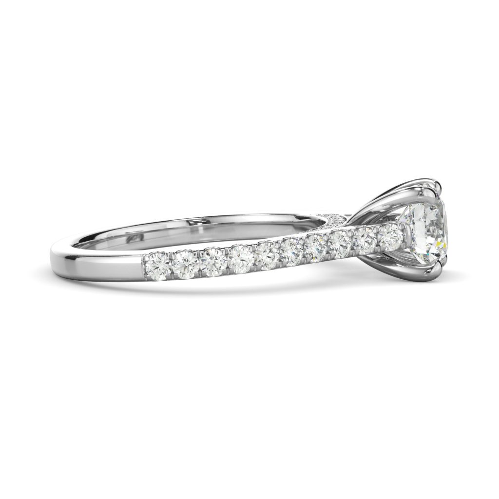 Only the best diamonds are set in this timeless and one of a kind engagement ring. Round diamonds lay in a beautiful arch, holding up your precious center stone!