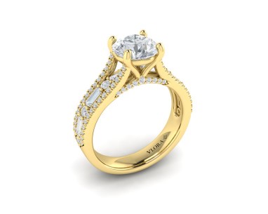 This exquisite engagement ring setting by Vlora blends bold architecture with timeless elegance. Crafted in rich 18K yellow gold, it features a split shank design adorned with a mix of round and baguette diamonds, leading the eye toward the center setting—ready to cradle the round diamond of your choice. With no halo, the silhouette remains clean and classic, allowing the brilliance of the band and the beauty of your chosen center stone to shine. At Ancona Jewelers, we celebrate every love story with heirloom-quality craftsmanship—designed to reflect your journey and made to last a lifetime.