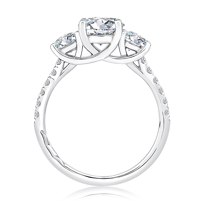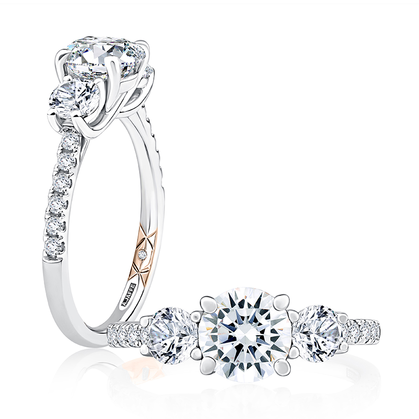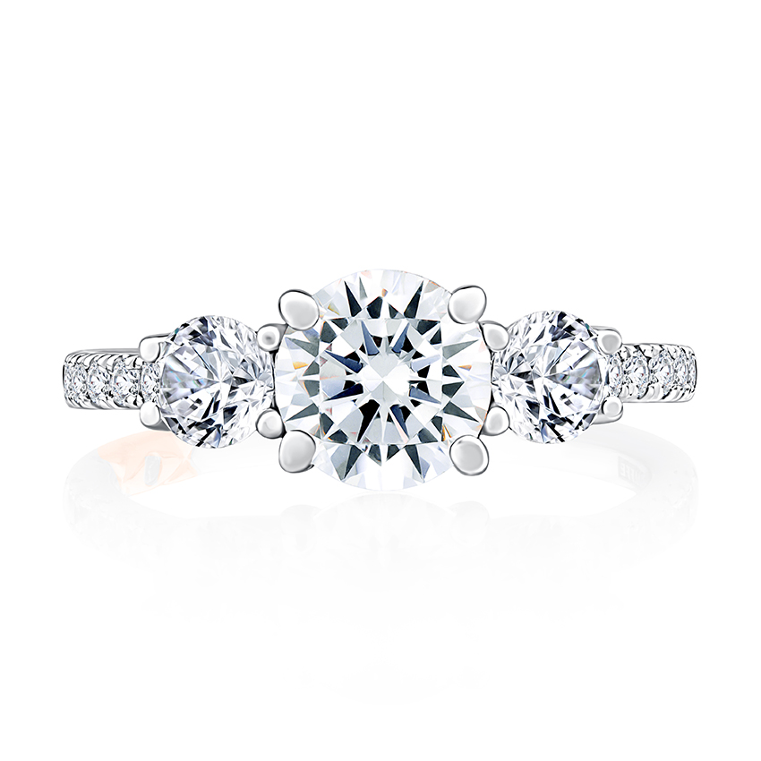 From the A.JAFFE Classics™ collection, this Engagement ring features a three stone trellis design. With a round cut center diamond, this ring defines luxury and class. This diamond engagement ring also feauters a true diamond pave diamond band which is guaranteed to give the ring a timeless look.