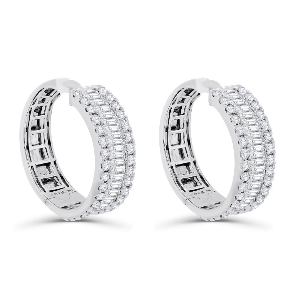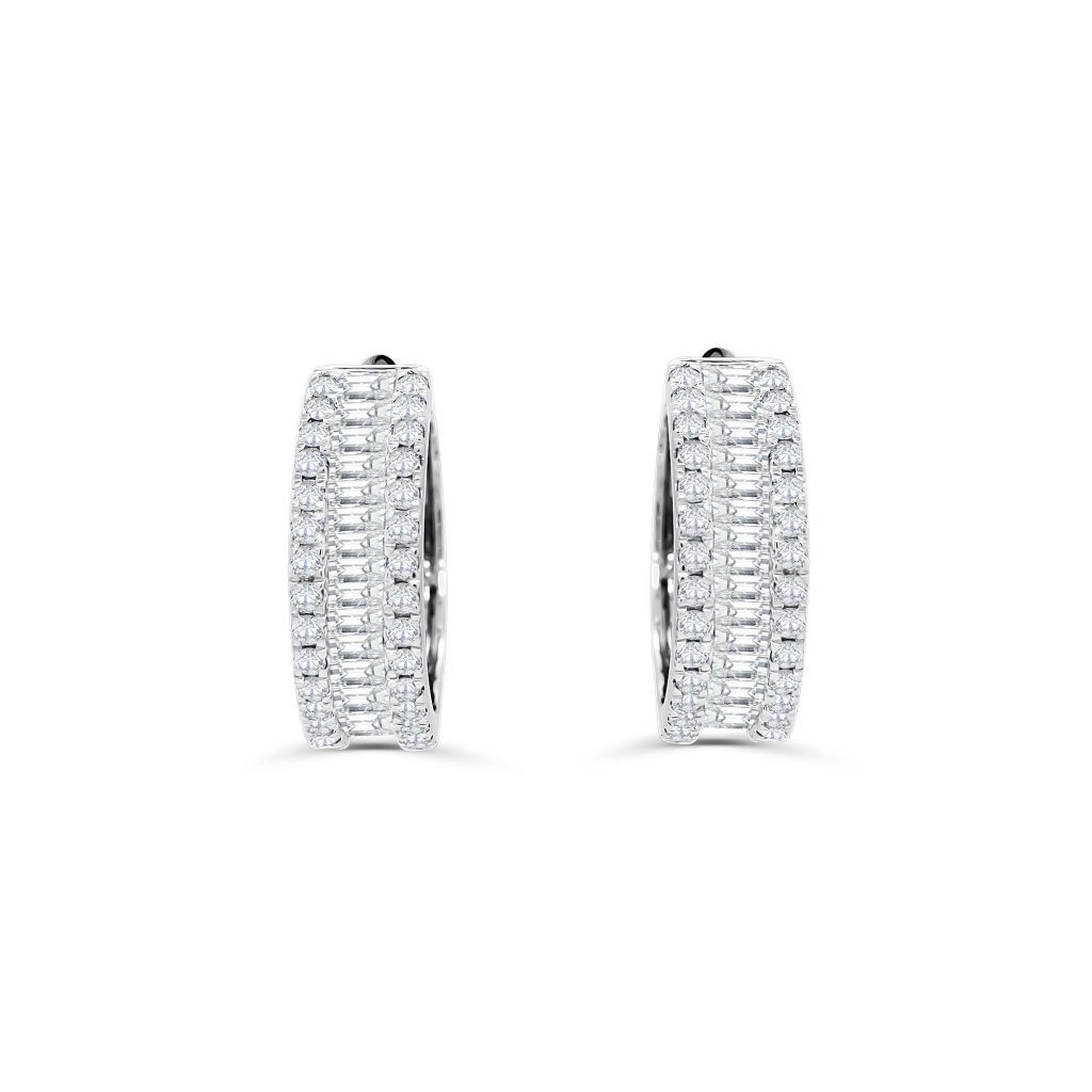 These statement hoops are wide set for extra sparkle, and set with dazzling round and baguette diamonds.