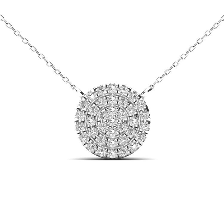 A dazzling disc of diamonds is featured at the center of this necklace.