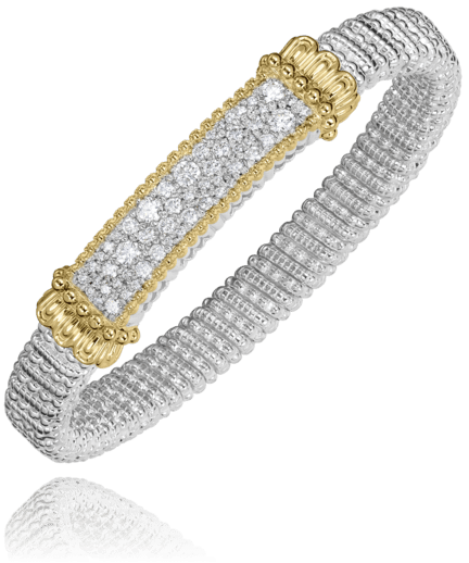 This Vahan bracelet is a radiant blend of artistry and sophistication. Crafted in signature two-tone gold, its flexible white gold band is richly textured, offering a luxurious feel and comfortable fit. At the center, a polished yellow gold accent frames a stunning panel of pavé-set diamonds, creating a bold contrast of brilliance and warmth. Whether worn alone or stacked, it’s a piece that makes a powerful yet graceful statement. At Ancona Jewelers, we proudly curate timeless designs like this—crafted to dazzle, made to endure.