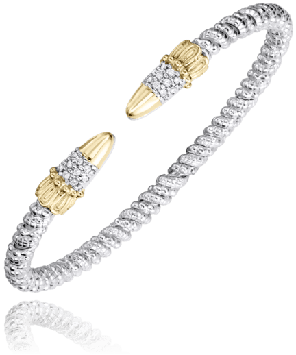 With an intricately textured Moiré Beaded® pattern, our stackable cuff bracelet is accented by crown motifs. Shimmering diamonds illuminate its 14K gold and sterling silver setting.