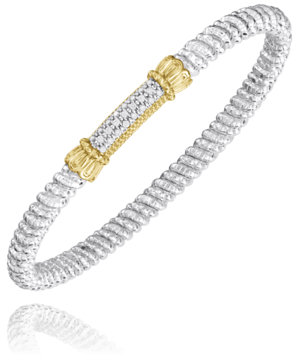 This luxurious bracelet combines 14k gold and sterling silver, adorned with 0.17 carats of ethically sourced diamonds. Its unique Moiré Beaded® pattern, crafted in the USA, offers a sophisticated and timeless look, while the customizable sizing ensures a perfect fit. Perfect for adding a touch of elegance to any ensemble.