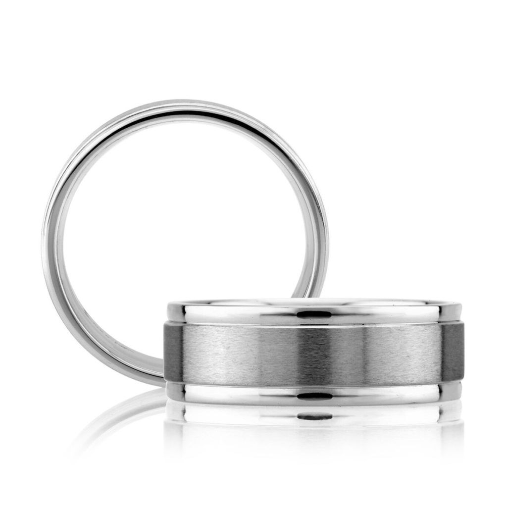 This refined band showcases a satin-finished center, offering a smooth, matte texture that contrasts elegantly with its high-polish step edges. The two-tone design enhances the visual appeal, creating a modern yet timeless look.