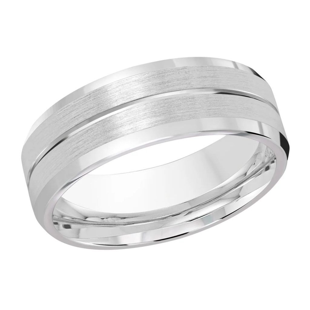 This sophisticated white gold wedding band features a high-polish groove along its satin center, complemented by slanted high-polish edges for a refined finish.