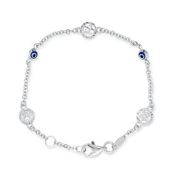 This petite white gold bracelet is set with 3 baby angel medallions, and two evil eye pendants.