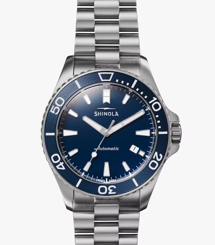 This 43mm Shinola Monster hits the mark when it comes to a dive watch you can trust. Its technical acumen makes the iconic aesthetic of Shinola an added bonus. Powered by the SW200-1 automatic movement, which features 26 jewels and a 38-hour power reserve, this high-grade 316L stainless steel timepiece is meticulously engineered to withstand extreme pressure and has a depth rating of 1,000 feet. With durable, anti-reflective sapphire crystal and an anti-magnetic shield, the Shinola Monster is designed specifically with divers in mind. A unidirectional bezel keeps track of precious time underwater, a stainless steel three-link bracelet with a micro-adjustable clasp provides a secure fit while diving. While its midnight blue dial reminds us of the stunning ice formations across Lake Michigan in the coldest months of winter, the star quality of this timepiece is its performance.