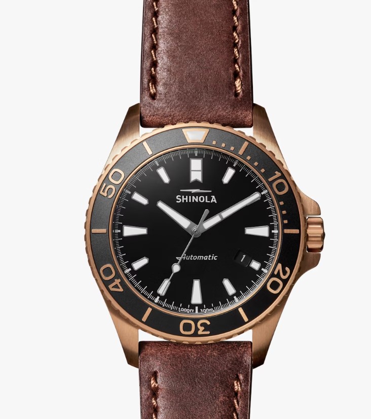 Meet the Kingpin of your watch collection. The Bronze Monster Gift Set will transport you back to the 1920s with an automatic timepiece that features a bronze case and dark colorways. Inspired by the Prohibition era and the stealth of rumrunners on Michigan waterways, this Shinola Monster commands attention in the most unassuming way. Powered by the SW200-1 automatic movement, which features 26 jewels and a 38-hour power reserve, this watch has a stainless steel caseback and an impressive dive watch aesthetic. Complemented by a khaki nylon strap, the gift set also includes a premium teak leather strap for easy swapping to suit your style. This 43mm timepiece lends itself to a wearer who has a bit of a rebellious side.