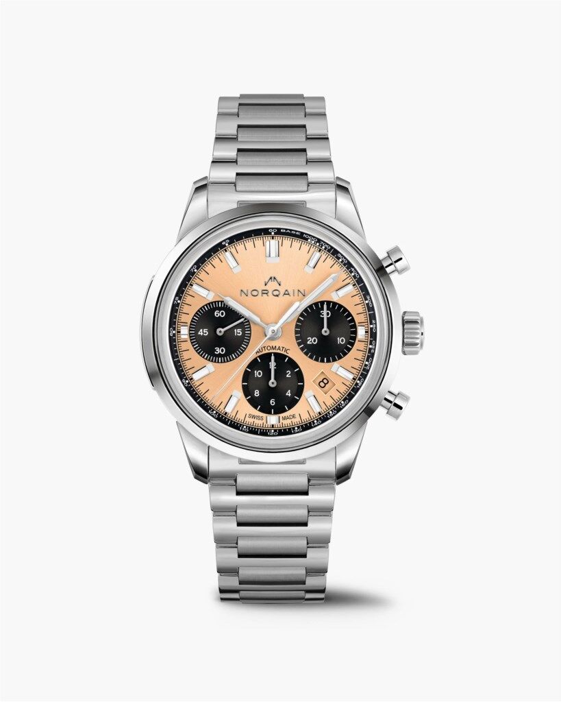 The Freedom collection is strongly tied to an appreciation of the great outdoors that carries across generations. The vintage-inspired design elements evoke the aesthetics of the 60s. This timepiece with a peach-coloured dial is limited to 300 pieces.