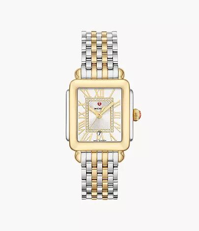 Together 18k gold plating and stainless give a chic look to MICHELE’s iconic collection. With diamonds indexes and signature MICHELE touches, the Deco Mid is a must for any watch lover. The two-tone stainless-steel bracelet is interchangeable with any 16mm MICHELE strap.