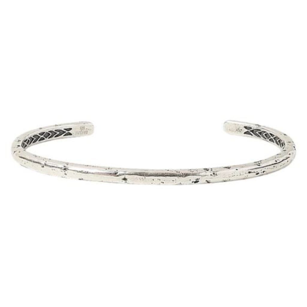 Ancient design meets contemporary luxury style with this silver cuff bracelet by John Varvatos. A simple thin width cuff styled bracelet is crafted from solid sterling silver to create a modern mens bracelet, with John Varvatos’ signature hammered metal pattern to give it an old world appeal.