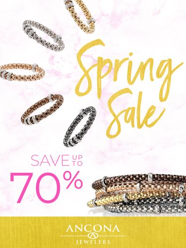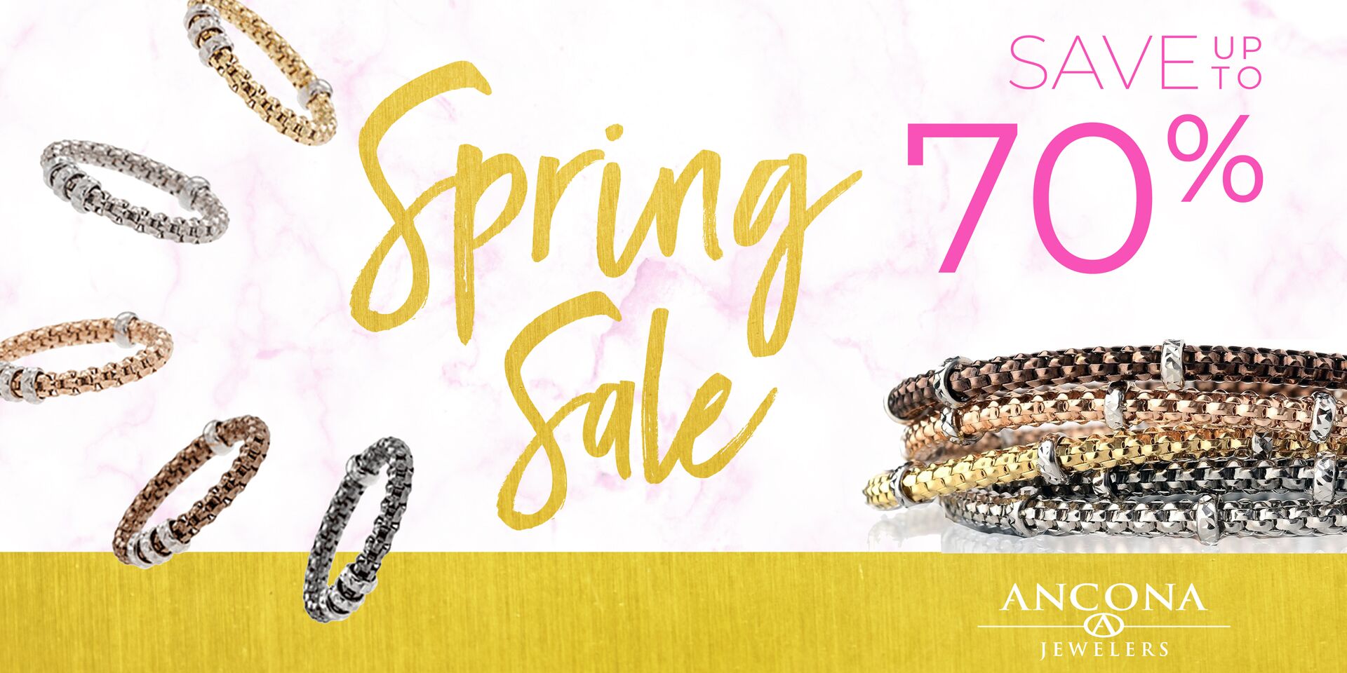 Spring Sale is Here by Massimo | Apr 14, 2022 | News & Events SPRING SALE Ancona Jewelers is having our Spring Sale! Shop the season’s biggest savings up to 70% OFF! Beautiful jewelry at unbeatable prices, shop before they’re gone! Shop Now Don't Miss these Great Savings! Day(s) : Hour(s) : Minute(s) : Second(s)