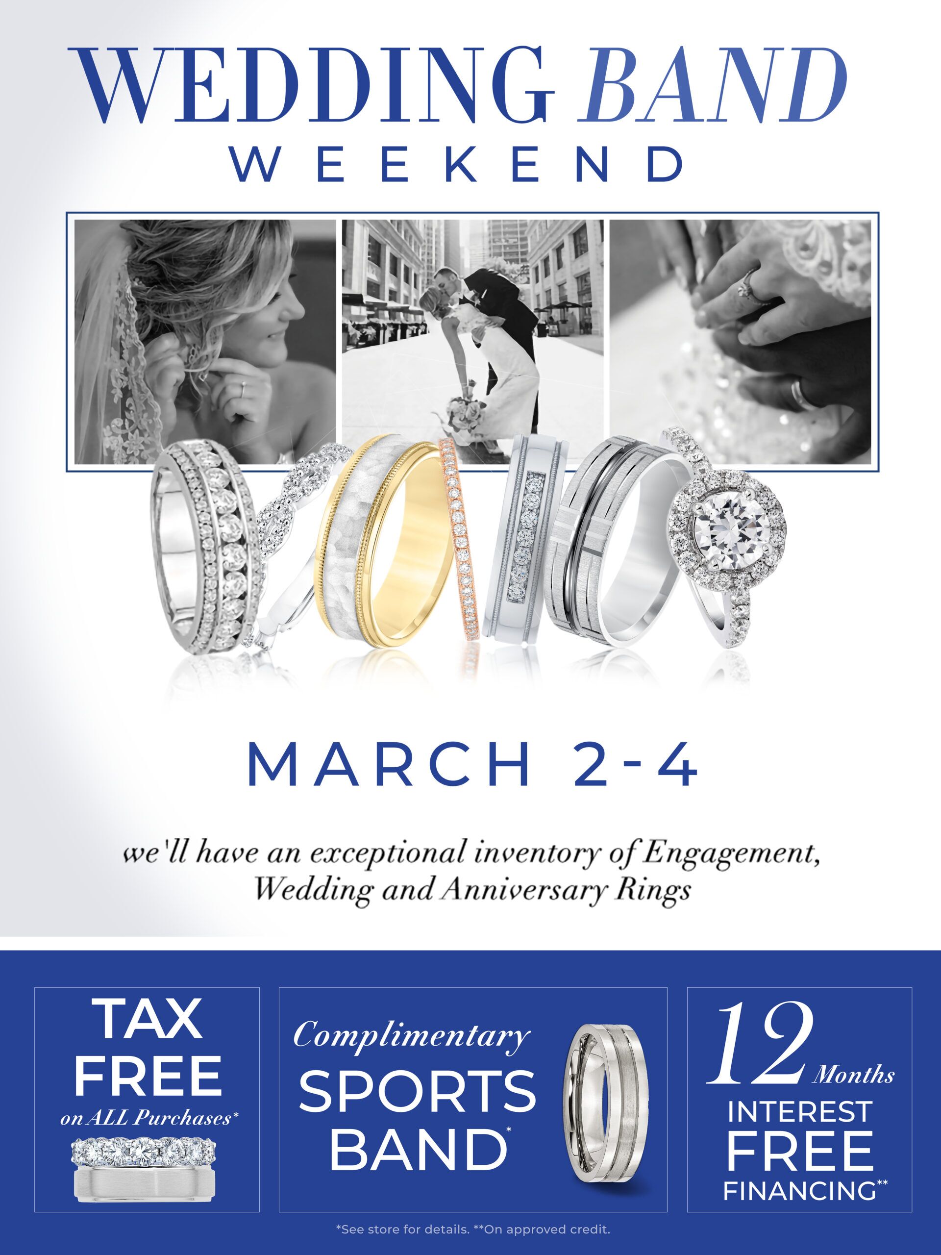 *Tax free promotion shall be applied as a respective discount of 7.62% to reduce effective price of purchases made during the Wedding Band Weekend Event. Ancona Jewelers is still obligated to collect sales taxes in compliance with local laws and regulations. NO rainchecks or substitutions unless otherwise stated. Offers must be redeemed in a single transaction; no cash back. May not be combined with any other offer including special financing terms, additional terms and conditions may apply, see store for details.