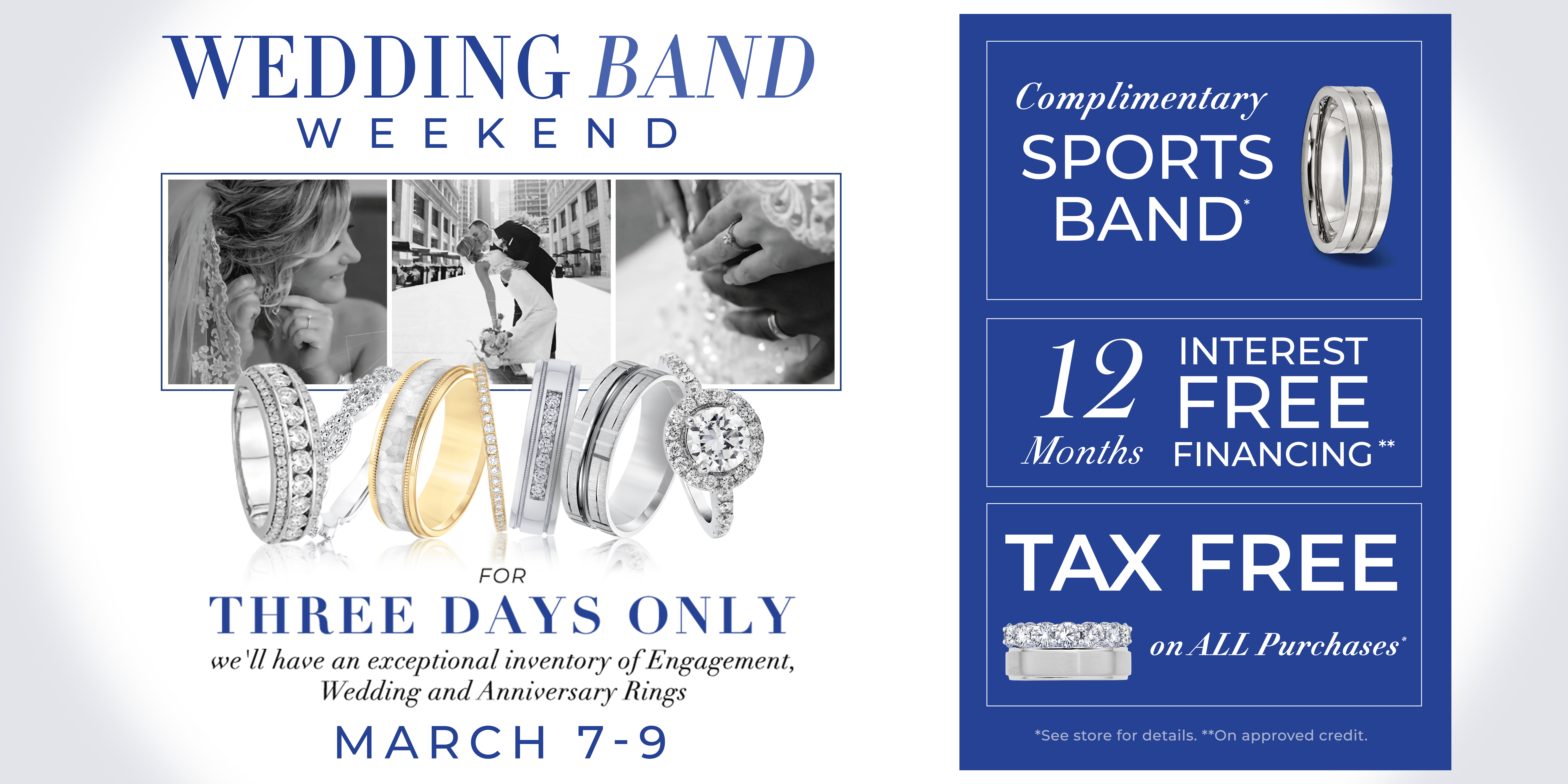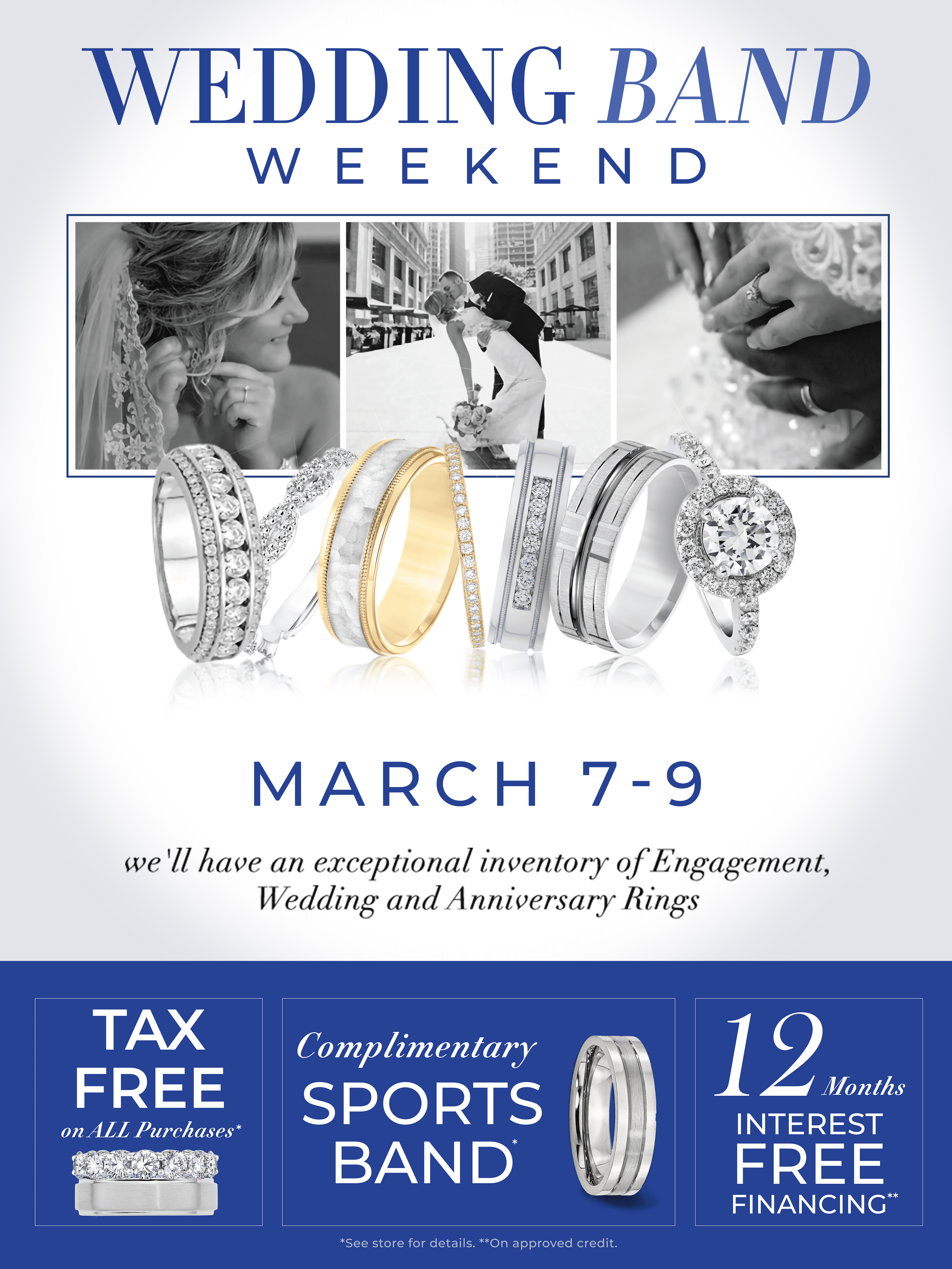 *Tax free promotion shall be applied as a respective discount of 7.62% to reduce effective price of purchases made during the Wedding Band Weekend Event. Ancona Jewelers is still obligated to collect sales taxes in compliance with local laws and regulations. NO rainchecks or substitutions unless otherwise stated. Offers must be redeemed in a single transaction; no cash back. May not be combined with any other offer including special financing terms, additional terms and conditions may apply, see store for details.
