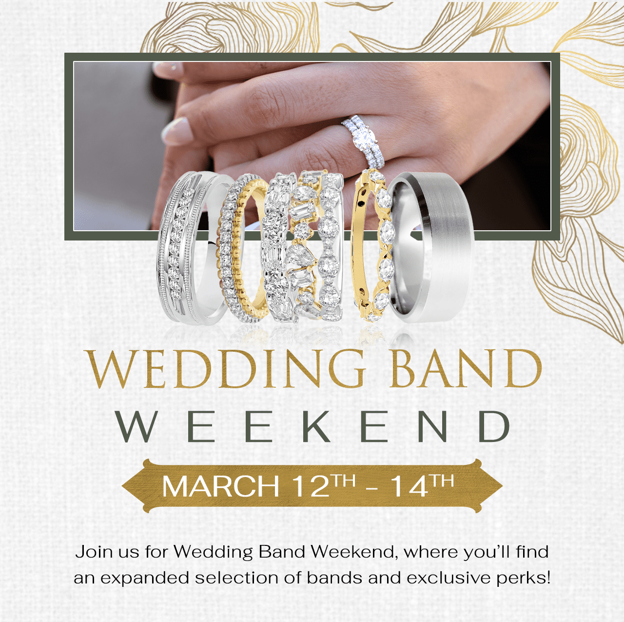 ****Tax free promotion shall be applied as a respective discount of 8.05% to reduce the effective price of purchases made during the Wedding Band Weekend Event. Ancona Jewelers is still obligated to collect sales taxes in compliance with local laws and regulations. NO rainchecks or substitutions unless otherwise stated. Offers must be redeemed in a single transaction; no cash back. Valid 3/12/26 to 3/14/26. May not be combined with any other offer including special financing terms, additional terms and conditions may apply, see store for details.